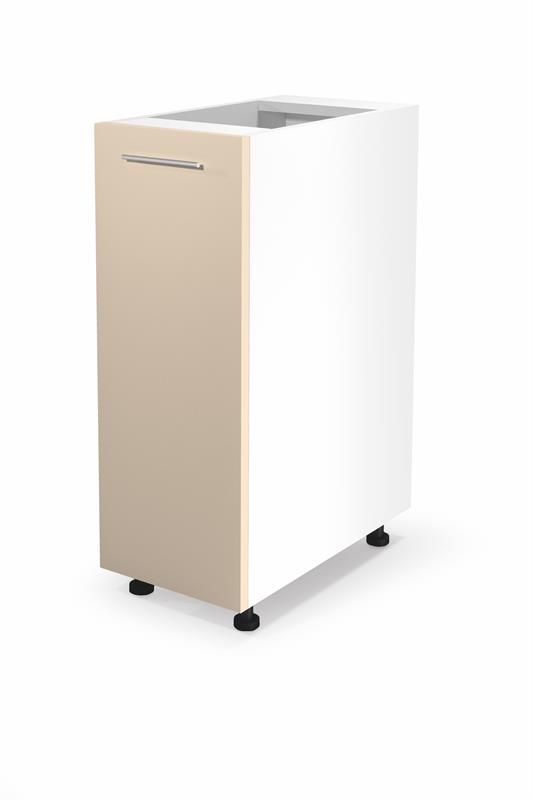 Spodní otevírací skříňka ze systému VENTO - jednodveřová skříňka do kuchyňské linky je uzavíratelná praktickými dvířky s širokým kovovým úchytem. Dvířka skříně jsou provedené v několika barevných variantách s korpusem v bílé barvě.