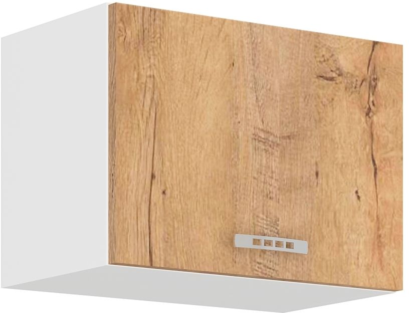 Skříňka pro digestoř ze systému SARA LEFKASS - skříňka do kuchyňské linky s praktickými výklopnými dvířky se širokým úchytem. Dvířka skříněk jsou provedené v moderním dubu lefkas. Dvířka skříňky se otevírají pomocí mechanických pístů.