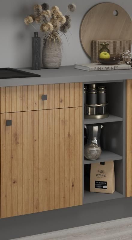 Kuchyňská linka ze systému AWA - dvířka skříněk jsou vyrobeny z MDF v dekoru dub artisan v kombinaci s korpusem v antracitu. Systém tichého dovíraní dvířek a zásuvek. Z modelové řady AWA lze sestavit kuchyňskou linku na míru vašemu interiéru.
