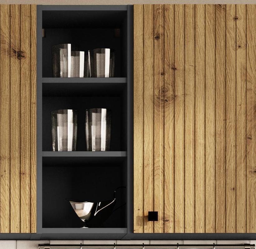 Kuchyňská linka ze systému AWA - dvířka skříněk jsou vyrobeny z MDF v dekoru dub artisan v kombinaci s korpusem v antracitu. Systém tichého dovíraní dvířek a zásuvek. Z modelové řady AWA lze sestavit kuchyňskou linku na míru vašemu interiéru.