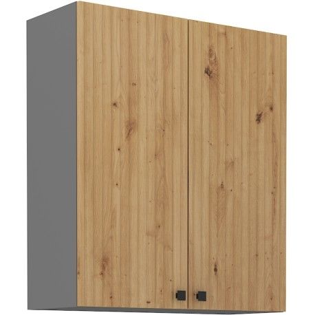 Horní otevírací skříňka ze systému AWA - skříňka do kuchyňské linky je uzavíratelná praktickými dvířky si kovovými úchyty. Dvířka skříněk jsou vyrobeny v provedení dub artisan v kombinaci s korpusem v antracitové barvě.