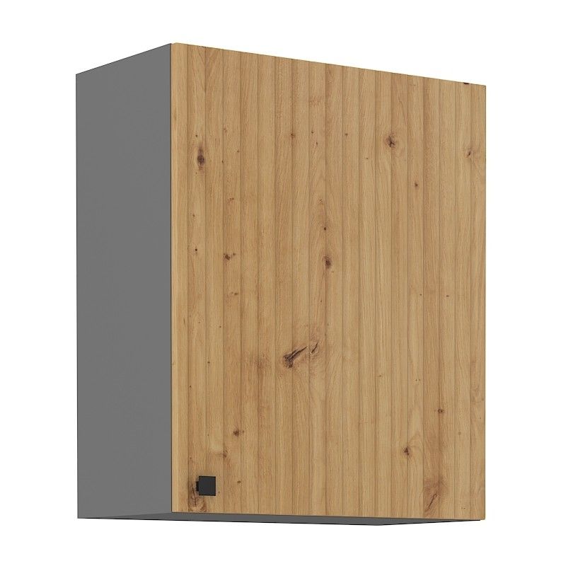 Horní otevírací skříňka ze systému AWA - skříňka do kuchyňské linky je uzavíratelná praktickými dvířky se kovovým úchytem. Dvířka skříněk jsou vyrobeny v provedení dub artisan v kombinaci s korpusem v antracitové barvě.