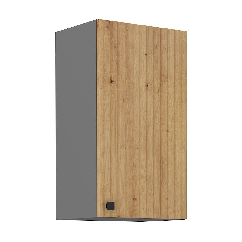 Horní otevírací skříňka ze systému AWA - skříňka do kuchyňské linky je uzavíratelná praktickými dvířky se kovovým úchytem. Dvířka skříněk jsou vyrobeny v provedení dub artisan v kombinaci s korpusem v antracitové barvě.
