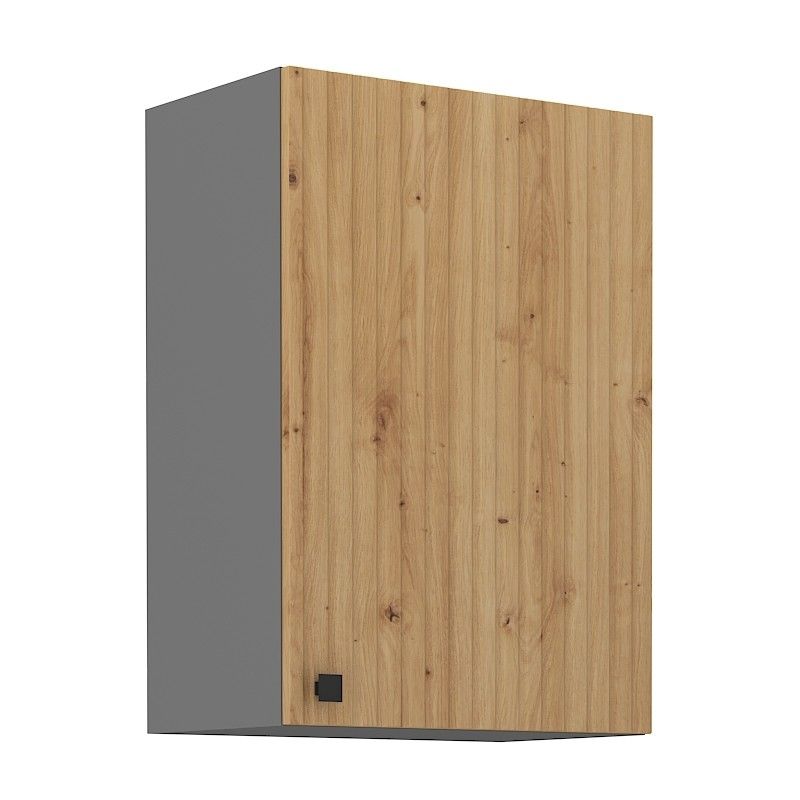 Horní otevírací skříňka ze systému AWA - skříňka do kuchyňské linky je uzavíratelná praktickými dvířky se kovovým úchytem. Dvířka skříněk jsou vyrobeny v provedení dub artisan v kombinaci s korpusem v antracitové barvě.