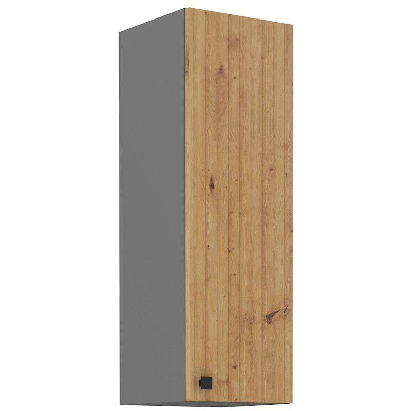 Horní otevírací skříňka ze systému AWA - skříňka do kuchyňské linky je uzavíratelná praktickými dvířky se kovovým úchytem. Dvířka skříněk jsou vyrobeny v provedení dub artisan v kombinaci s korpusem v antracitové barvě.