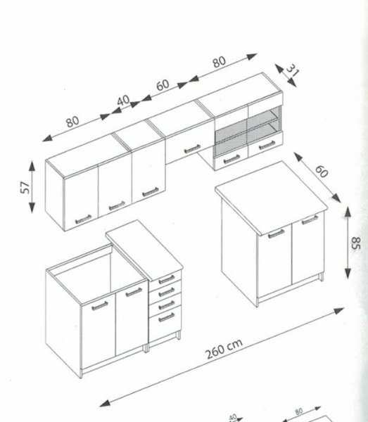 - horní řada kuchyňské linky: 80 ( 2 dvířková ) + 40 ( 1 dvířka ) + 60 ( skříňka nad sporák + 80 ( 2 dvířková )
