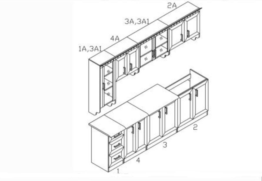 - horní řada kuchyňské linky: 40 ( 1 dvířková, prosklenná ) + 80 ( 2 dvířková ) + 80 ( 2 dvířková, prosklenná ) + 60 ( 2 dvířková )