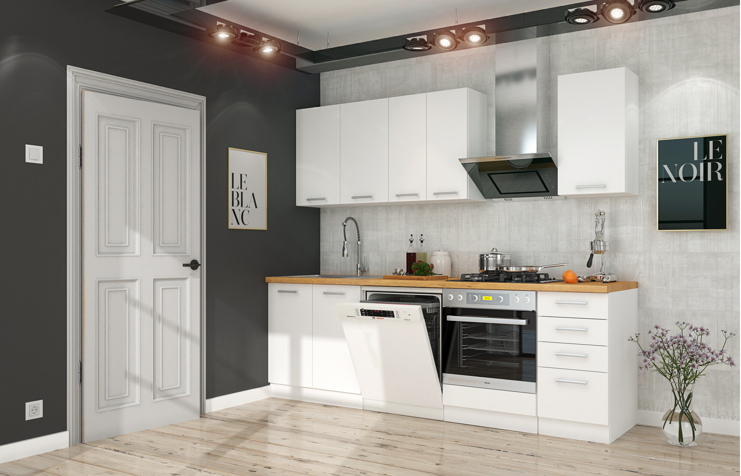 Kuchyňská linka EKO VHITE 2 - barevné provedení: korpus + dvířka bílý mat. Sestavu lze libovolně doplnit o skříňky ze sektorového systému EKO VHITE.