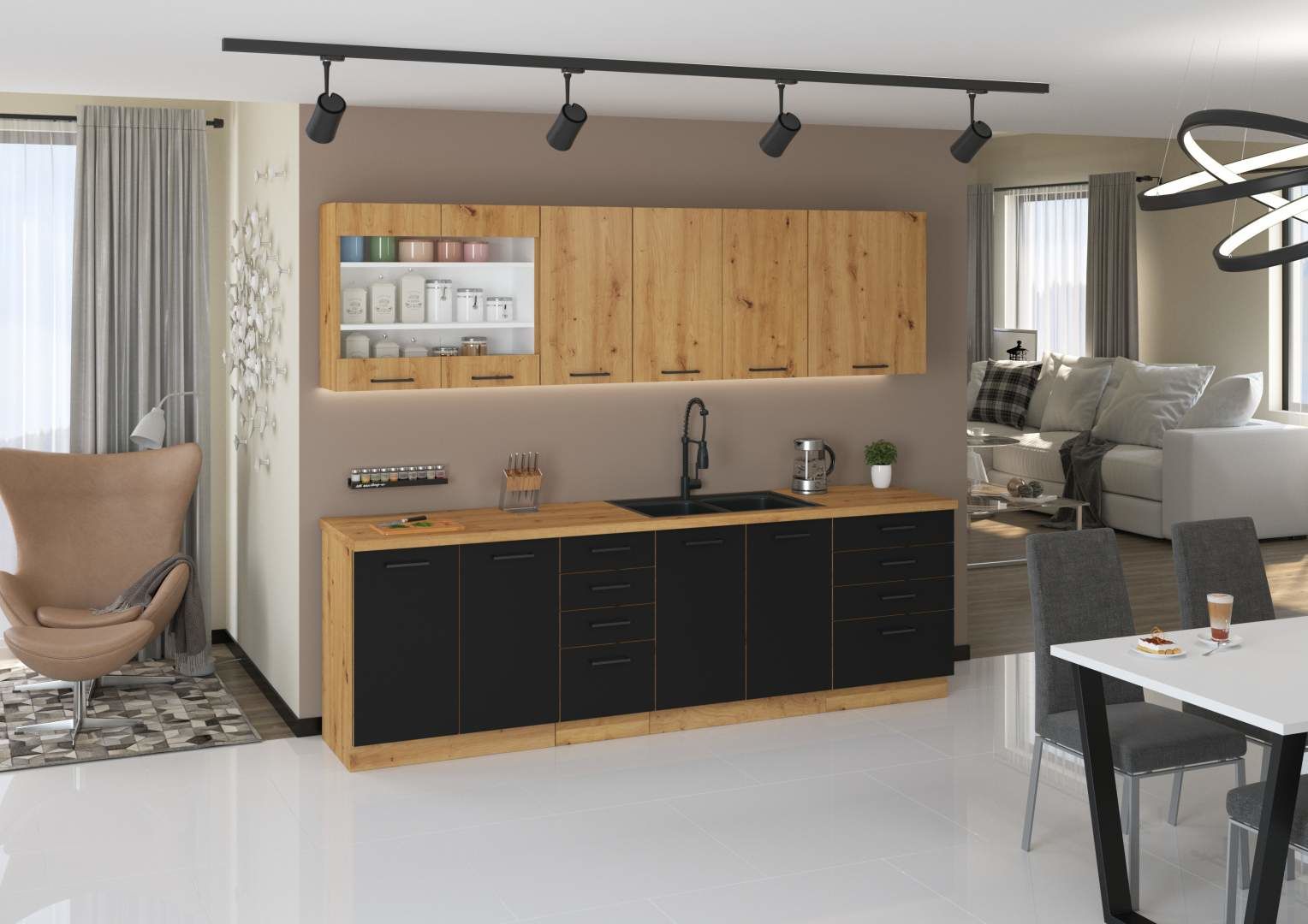 Moderní kuchyňská linka v barevném provedení korpus dub artisan + dvířka černá matná. Kuchyňská linka má atraktivní moderní vzhled je tak ideální volbou pro Vaši kuchyni. Dvířka kuchyňských skříněk nebo šuplíků mají tiché zavírání dvířek. U skříněk s výklopem se dvířka zvedají pomocí plynových pístů. V ceně kuchyňské linky jsou plastové úchyty.