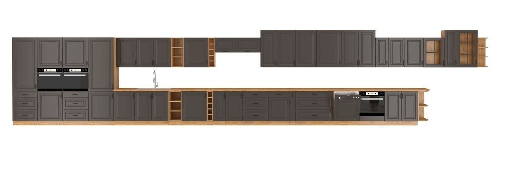 Pracovní deska a spotřebiče nejsou součástí. Pracovní desku lze objednat v dekorech z naší aktuální nabídky.
