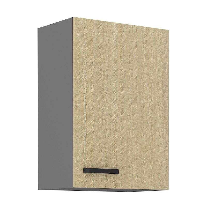 Horní otevírací skříňka ze systému SCANDY - skříňka do kuchyňské linky je uzavíratelná praktickými dvířky s kovovým úchytem. Dvířka skříněk jsou vyrobeny v dekoru jedle scandi s korpusem v antracitové barvě.