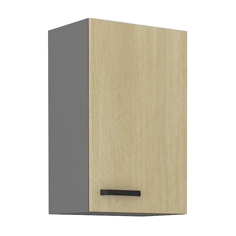 Horní otevírací skříňka ze systému SCANDY - skříňka do kuchyňské linky je uzavíratelná praktickými dvířky s kovovým úchytem. Dvířka skříněk jsou vyrobeny v dekoru jedle scandi s korpusem v antracitové barvě.