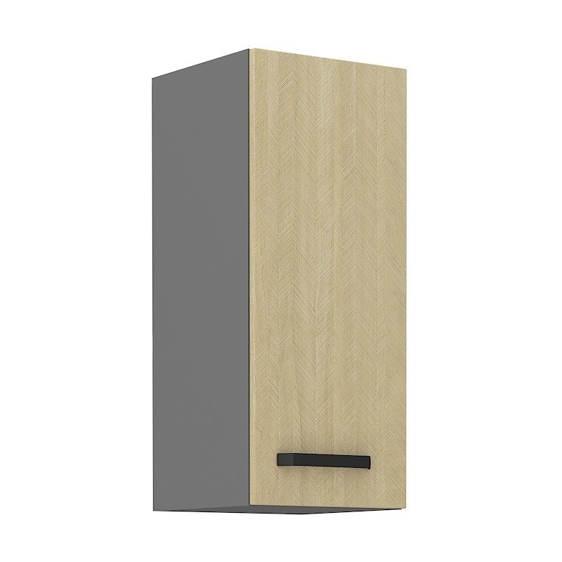 Horní otevírací skříňka ze systému SCANDY - skříňka do kuchyňské linky je uzavíratelná praktickými dvířky s kovovým úchytem. Dvířka skříněk jsou vyrobeny v dekoru jedle scandi s korpusem v antracitové barvě.