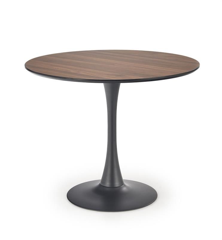 Jídelní stůl OLMO - je moderní kulatý jídelní stůl vyrobený z dýhované MDF desky v barvě ořech a designové nohy z černé lakované oceli. Stůl je vhodný do moderní jídelny.