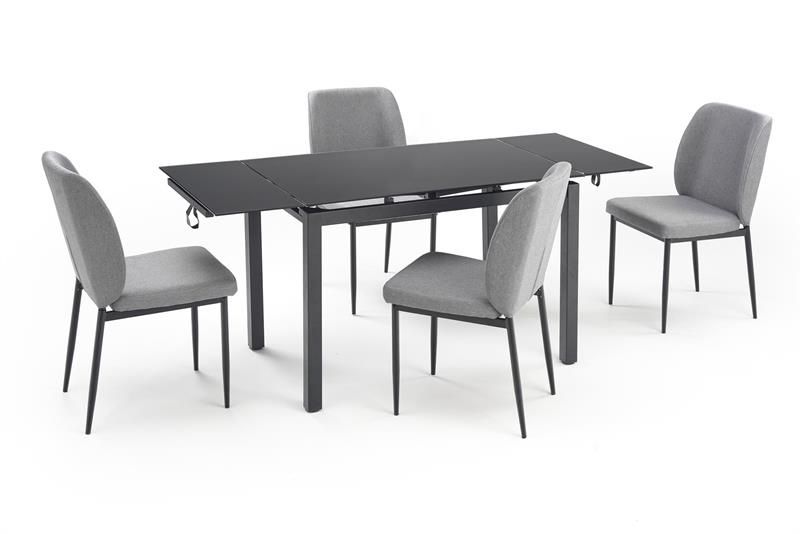 Jídelní set JASPER - je moderní rozkládací jídelní stůl vyrobený z kvalitní lakované oceli se skleněnou deskou v černém provedení včetně čtyř polstrovaných jídelních židlí.