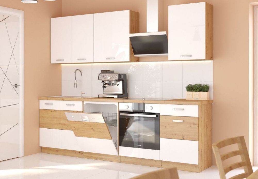 Moderní kuchyňská linka v barevném provedení korpus Dub Artisan + dvířka Bílý lesk / dub Artisan. Kuchyňská linka má atraktivní moderní vzhled je tak ideální volbou pro Vaši kuchyni. Dvířka kuchyňských skříněk nebo šuplíků mají tiché zavírání dvířek. U skříněk s výklopem se dvířka zvedají pomocí plynových pístů. V ceně kuchyňské linky jsou kovové úchyty.