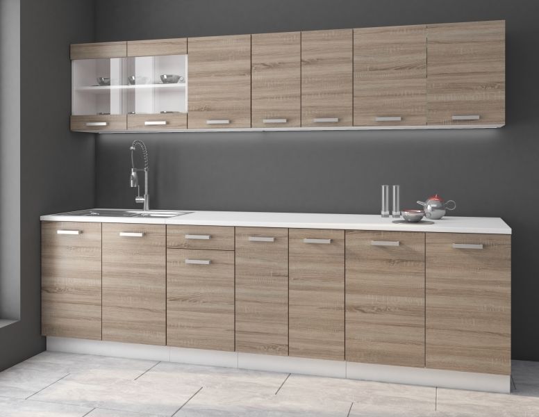Moderní kuchyňská linka v barevném provedení korpus bílá + dvířka dub sonoma Trufel. Kuchyňská linka má atraktivní moderní vzhled je tak ideální volbou pro Vaši kuchyni. U skříněk s výklopem se dvířka zvedají pomocí plynových pístů. V ceně kuchyňské linky jsou plastové úchyty.