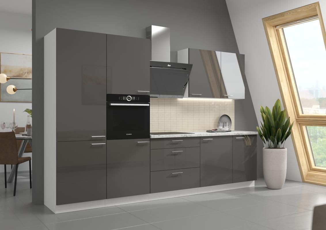 Kuchyňská linka LARA GREY 2 ze systému LARA GREY je vybavena dvířky s širokými kovovými úchyty. Dvířka skříněk jsou vyrobeny v šedém lesklém provedení v kombinaci s bílým korpusem.