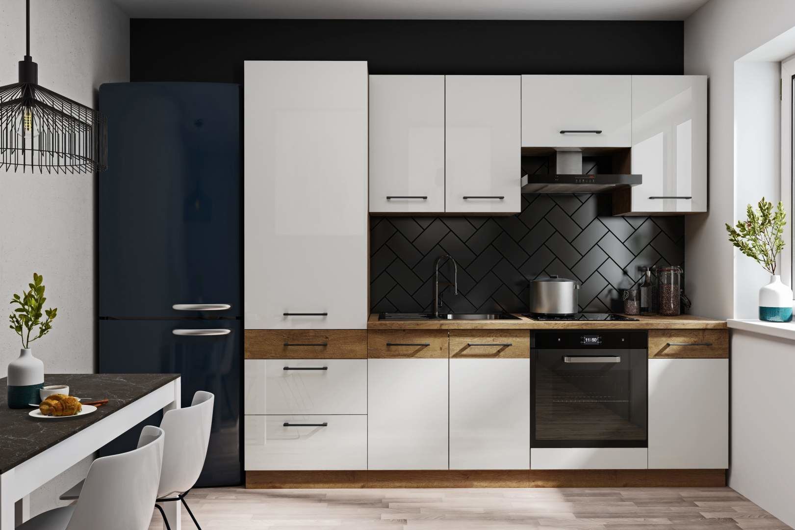Moderní kuchyňská linka v barevném provedení korpus Dub Lancelot + dvířka Bílý lesk. Kuchyňská linka má atraktivní moderní vzhled je tak ideální volbou pro Vaši kuchyni. Dvířka kuchyňských skříněk nebo šuplíků mají tiché zavírání dvířek. U skříněk s výklopem se dvířka zvedají pomocí plynových pístů. V ceně kuchyňské linky jsou plastové úchyty, které je možnost za příplatek nahradit kovovými.