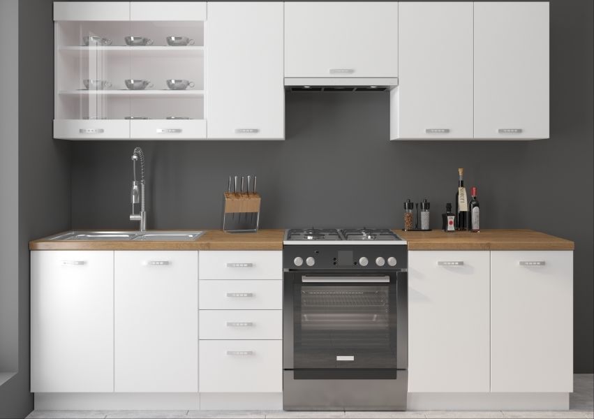 Moderní kuchyňská linka v barevném provedení korpus Bílý + dvířka Bílý mat / PCV. Kuchyňská linka má atraktivní moderní vzhled je tak ideální volbou pro Vaši kuchyni. U skříněk s výklopem se dvířka zvedají pomocí plynových pístů. V ceně kuchyňské linky jsou plastové úchyty.