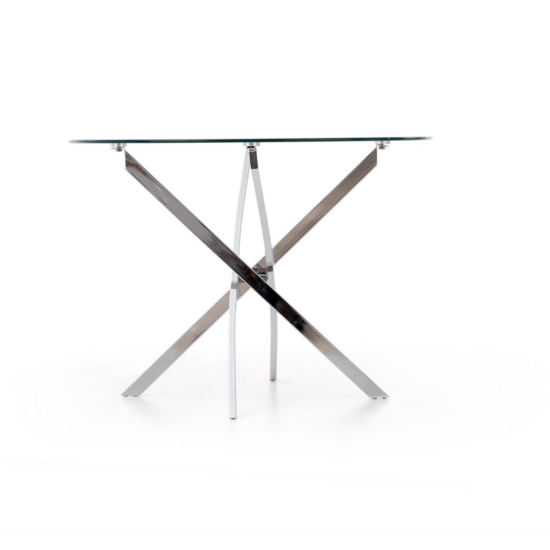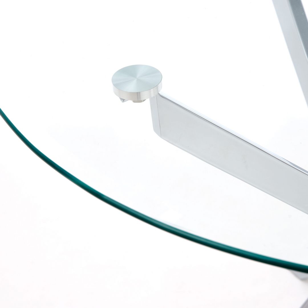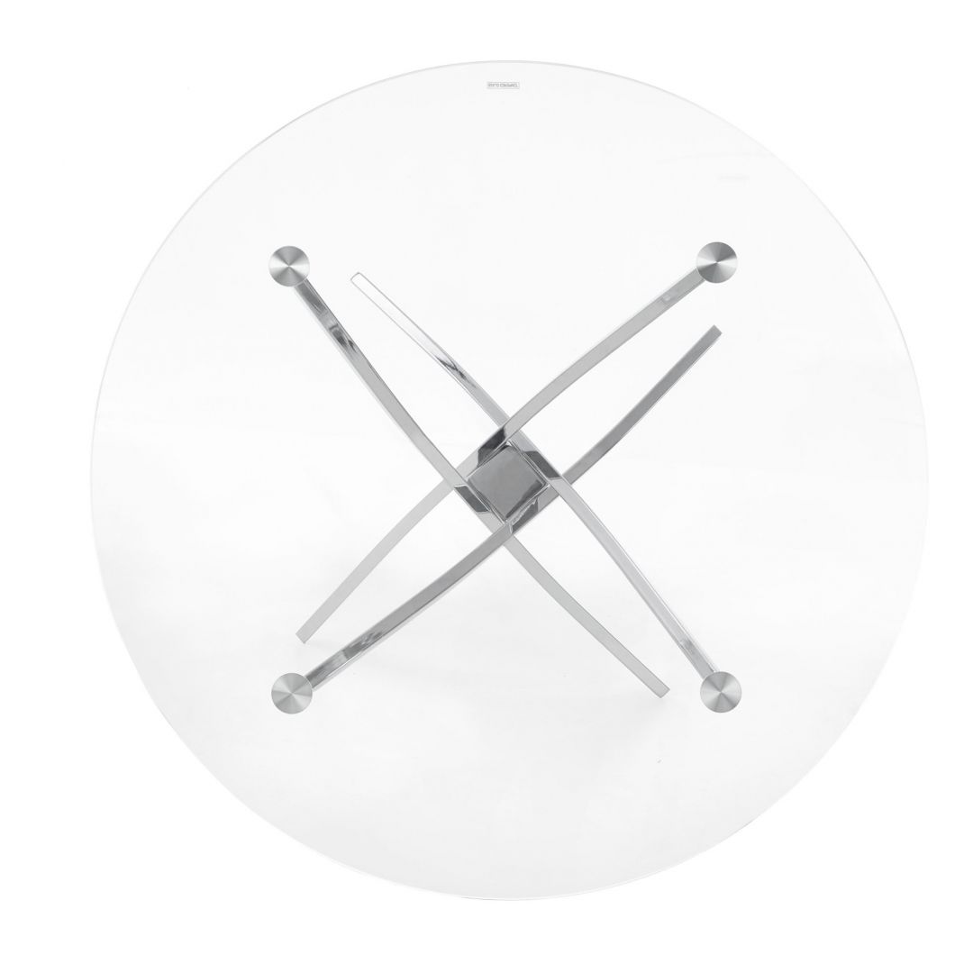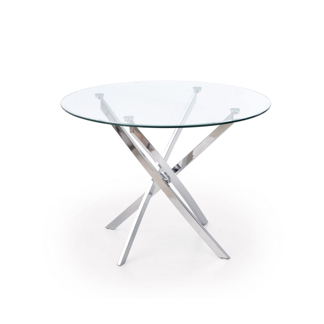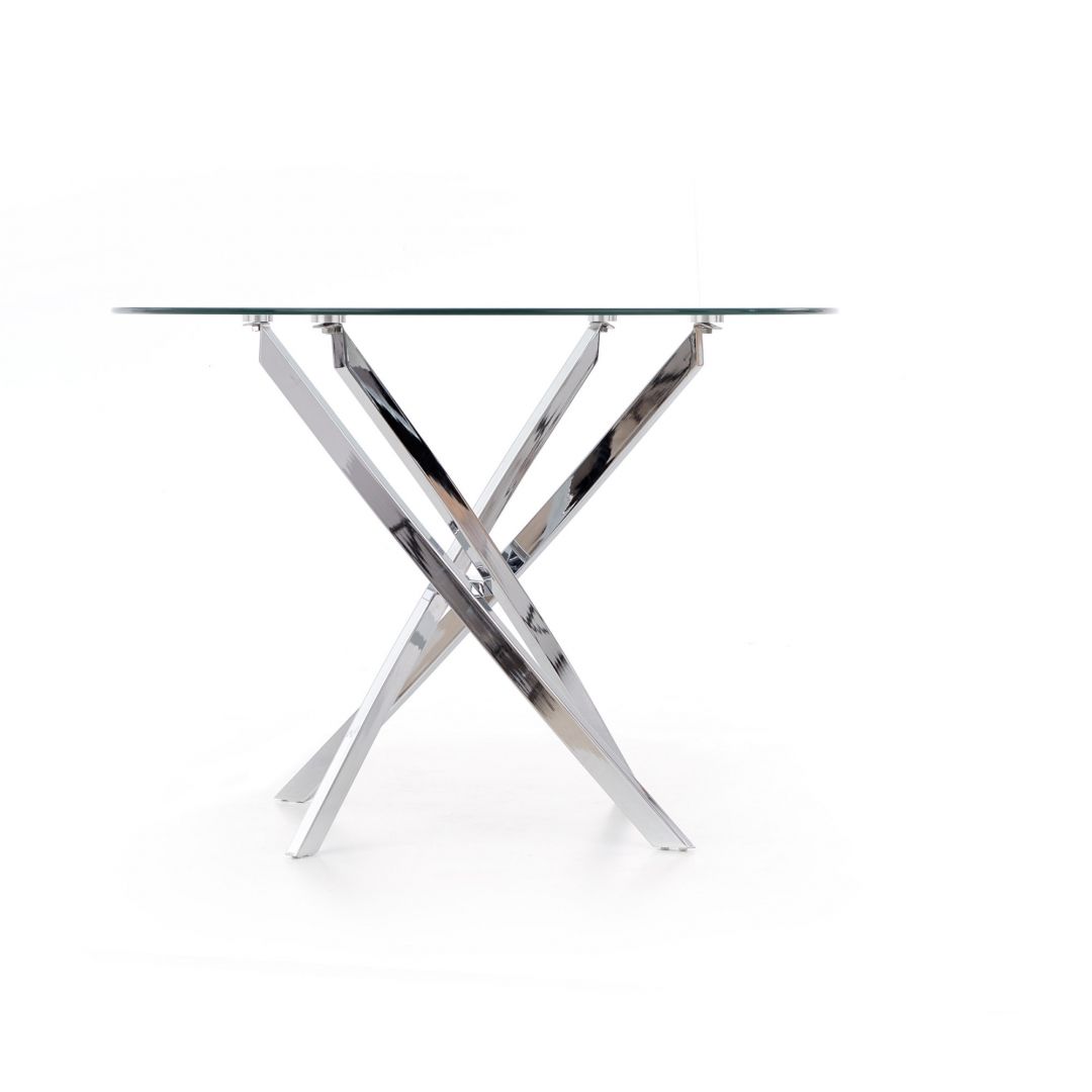 Jídelní stůl RAYMOND - je stůl na centrální podnoži je vyroben v kombinaci chromované oceli ve stříbrné nebo zlaté barvě a tvrzeného čirého skla. Tento designový stůl je výborně hodí do moderní jídelny.