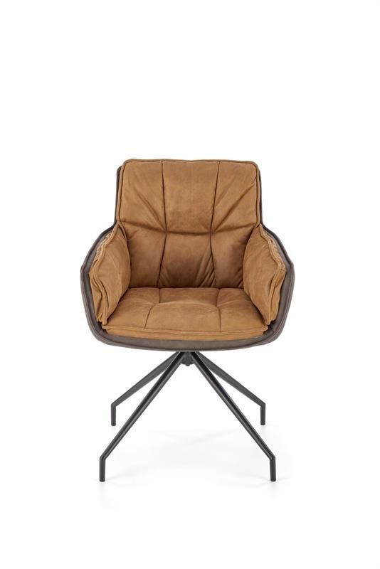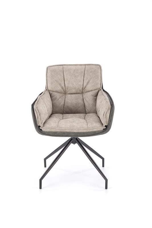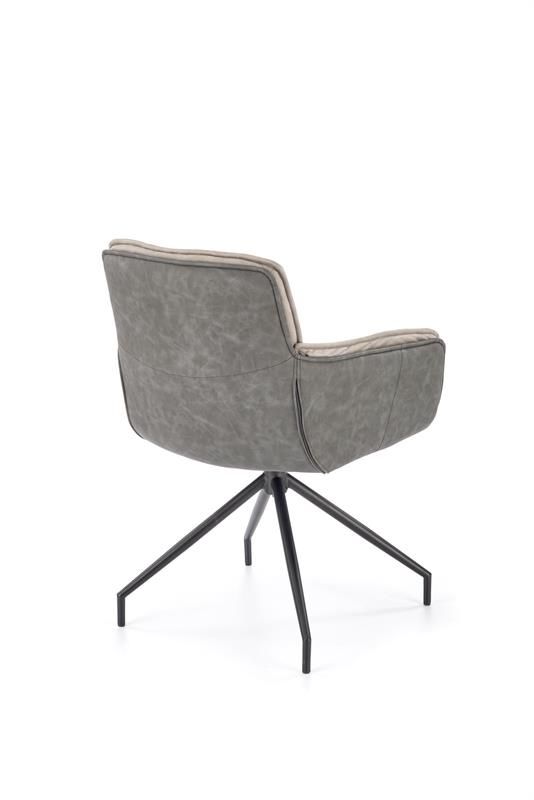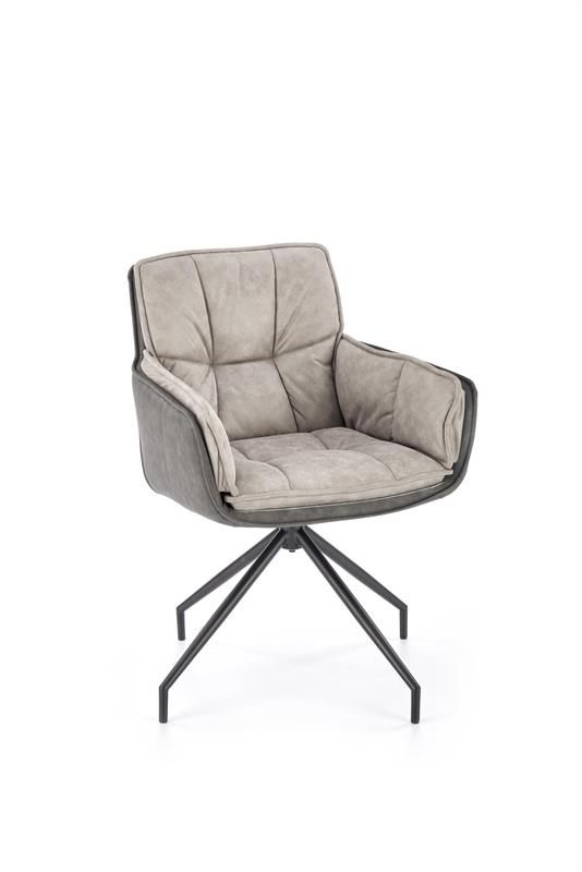 Jídelní židle K523 - je elegantní otočná židle vyrobena v kombinaci lakované oceli v černé barvě a pohodlného sedáku a opěráku čalouněným v šedé a hnědé látce v kombinaci s ekokůží.