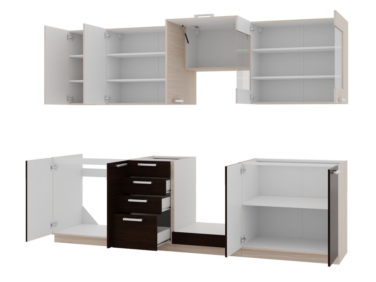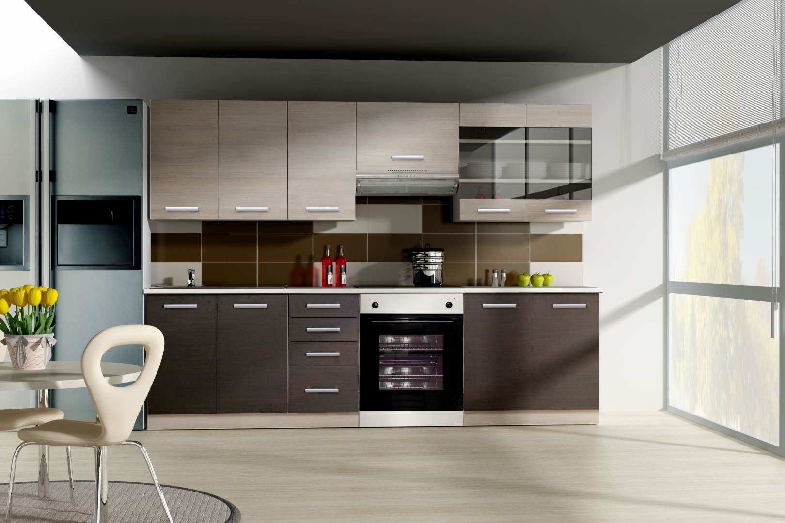 Kuchyňská linka CHAMONI 260 - provedení kuchyňské linky CHAMONI + dvířka lamino v barvné kombinaci: korpus dub Ferrara a čela dvířek dub Ferrara a tmavý Legno.