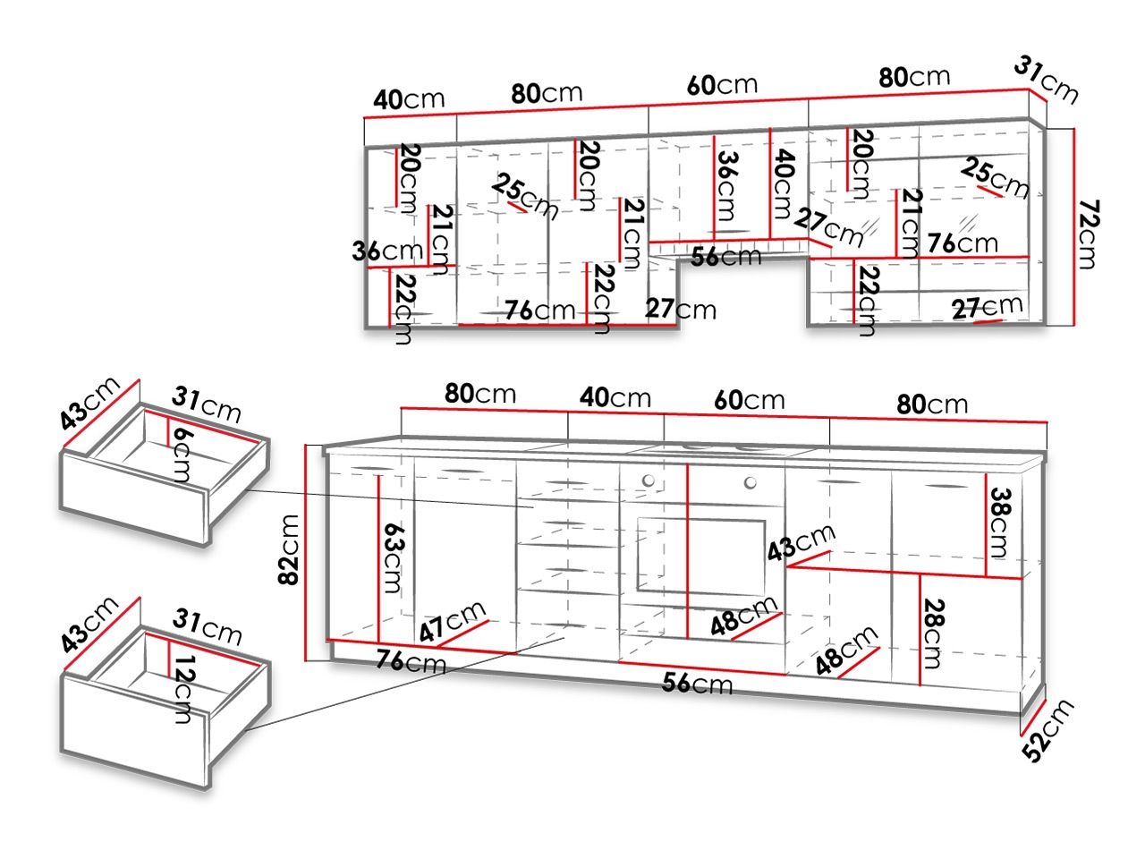 Skříňky kuchyňského systému jsou variabilní a můžete si je tak poskládat stejně jako na fotografiích nebo jakkoliv jinak dle vašich rozměrů, které máte v kuchyni k dispozici.