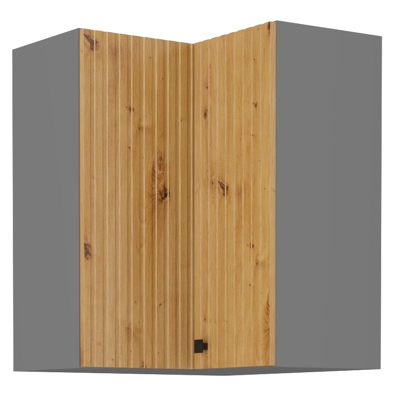 Horní rohová skříňka ze systému AWA - rohová skříňka do kuchyňské linky je uzavíratelná praktickými dvířky s kovovými úchyty. Dvířka skříněk jsou vyrobeny v provedení dub artisan v kombinaci s korpusem v antracitové barvě.