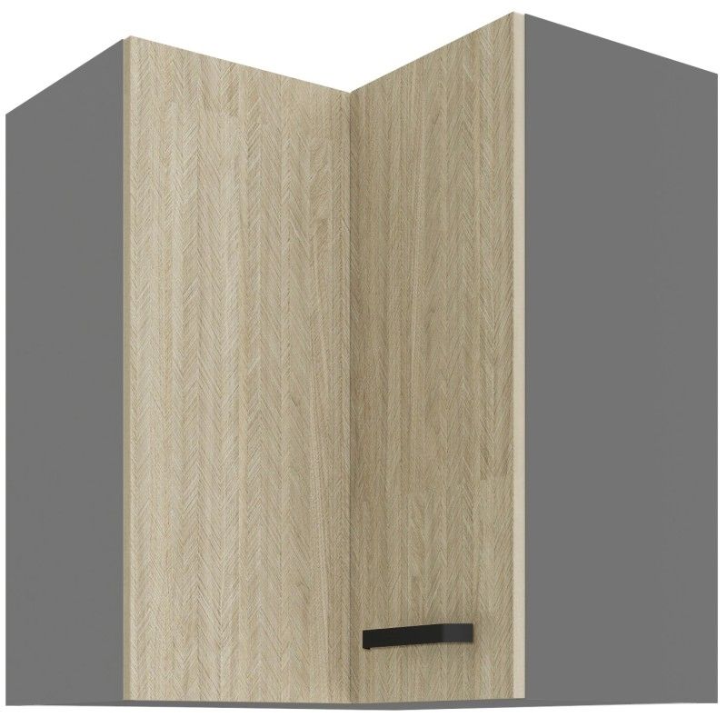 Horní rohová skříňka ze systému SCANDY - rohová skříňka do kuchyňské linky je uzavíratelná praktickými dvířky s kovovými úchyty. Dvířka skříněk jsou vyrobeny v dekoru jedle scandi s korpusem v antracitové barvě.