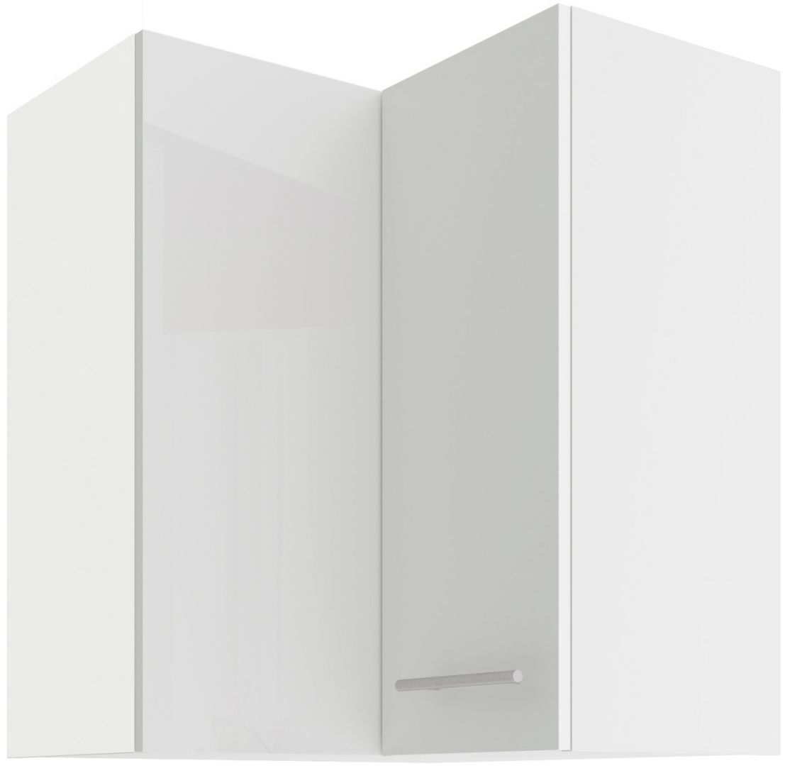 Horní skříňka ze systému LARA WHITE - rohová skříňka do kuchyňské linky je vybavena dvířky s širokým kovovým úchytem. Dvířka skříněk jsou vyrobeny v bílém lesklém provedení v kombinaci s bílým korpusem.
