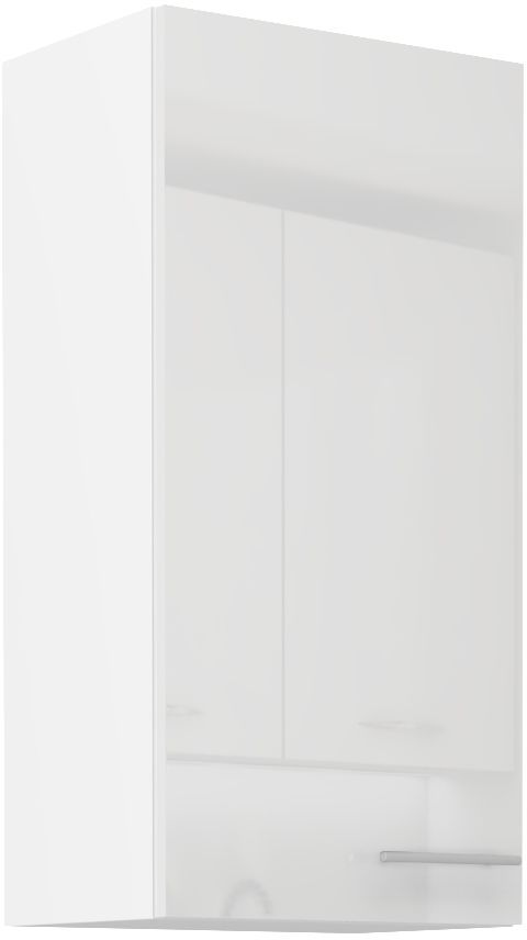 Horní skříňka ze systému LARA WHITE - skříňka do kuchyňské linky je vybavena dvířky s širokým kovovým úchytem. Dvířka skříněk jsou vyrobeny v bílém lesklém provedení v kombinaci s bílým korpusem.