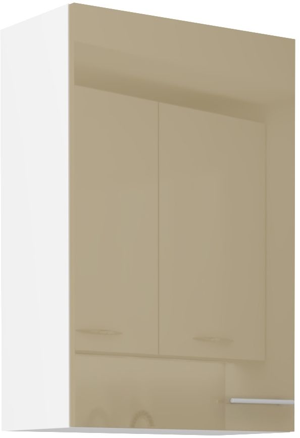 Horní skříňka ze systému LARA CAPPUCINO - skříňka do kuchyňské linky je vybavena dvířky s širokým kovovým úchytem. Dvířka skříněk jsou vyrobeny v cappucino lesklém provedení v kombinaci s bílým korpusem.