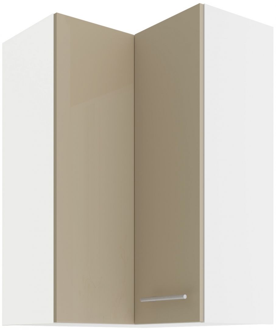 Horní skříňka ze systému LARA CAPPUCINO - rohová skříňka do kuchyňské linky je vybavena dvířky s širokým kovovým úchytem. Dvířka skříněk jsou vyrobeny v cappucino lesklém provedení v kombinaci s bílým korpusem.