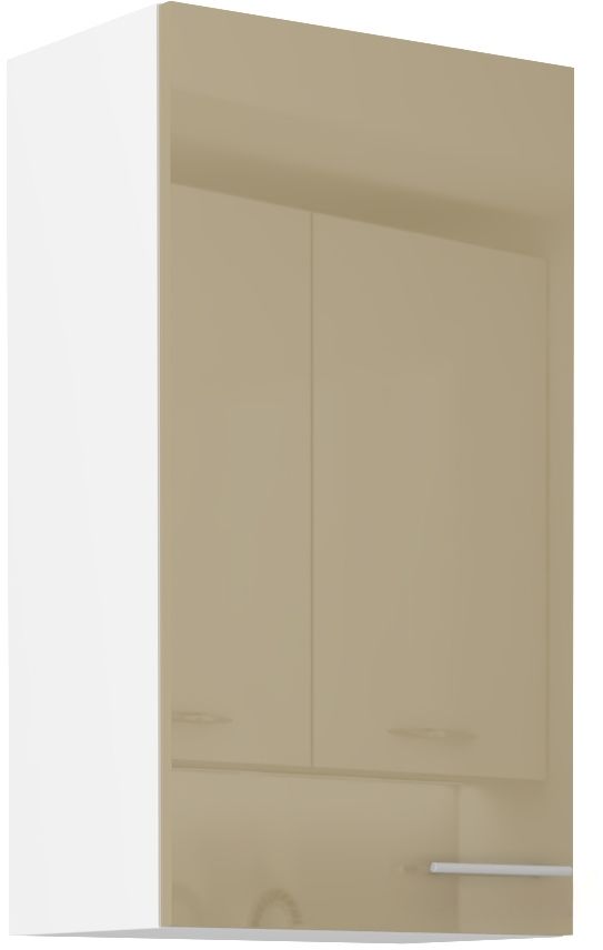 Horní skříňka ze systému LARA CAPPUCINO - skříňka do kuchyňské linky je vybavena dvířky s širokým kovovým úchytem. Dvířka skříněk jsou vyrobeny v cappucino lesklém provedení v kombinaci s bílým korpusem.
