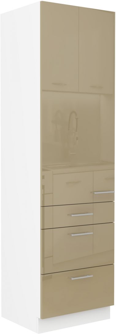 Potravinová skříň ze systému LARA CAPPUCINO - skříň do kuchyňské linky je vybavena dvířky s širokými kovovými úchyty a šuplíky. Dvířka skříně jsou vyrobeny v cappucino lesklém provedení v kombinaci s bílým korpusem.