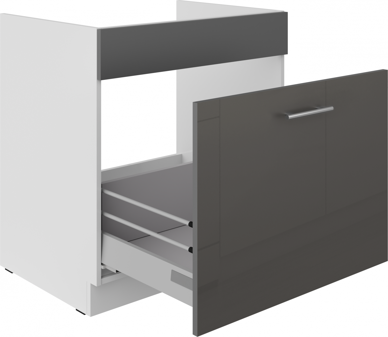 Spodní dřezová skříňka ze systému LARA GREY - dřezová skříňka do kuchyňské linky je vybavena šuplíkem s širokým kovovým úchytem. Dvířka skříněk jsou vyrobeny v šedém lesklém provedení v kombinaci s bílým korpusem.