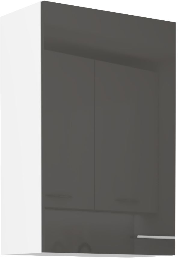 Horní skříňka ze systému LARA GREY - skříňka do kuchyňské linky je vybavena dvířky s širokým kovovým úchytem. Dvířka skříněk jsou vyrobeny v šedém lesklém provedení v kombinaci s bílým korpusem.