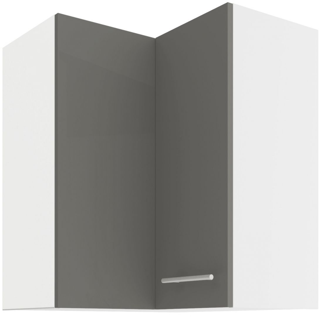 Horní skříňka ze systému LARA GREY - rohová skříňka do kuchyňské linky je vybavena dvířky s širokým kovovým úchytem. Dvířka skříněk jsou vyrobeny v šedém lesklém provedení v kombinaci s bílým korpusem.