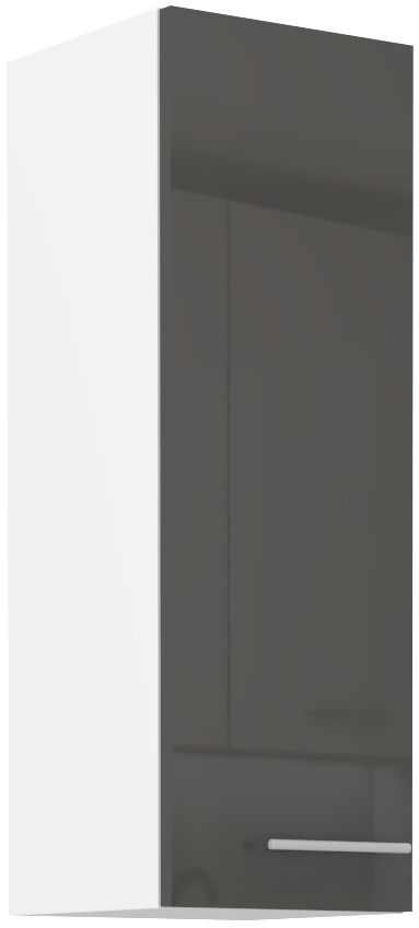 Horní skříňka ze systému LARA GREY - skříňka do kuchyňské linky je vybavena dvířky s širokým kovovým úchytem. Dvířka skříněk jsou vyrobeny v šedém lesklém provedení v kombinaci s bílým korpusem.