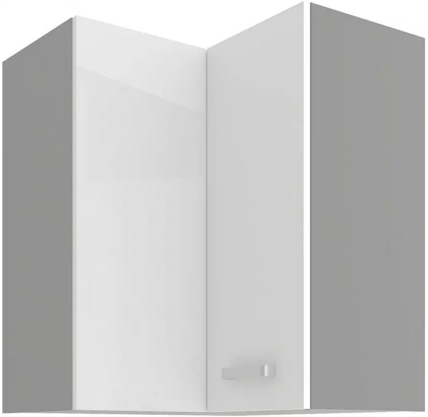 Horní rohová skříňka ze systému BIANCA - rohová skříňka do kuchyňské linky je uzavíratelná praktickými dvířky se širokými úchyty. Dvířka skříněk jsou provedené v moderním bílém lesku.