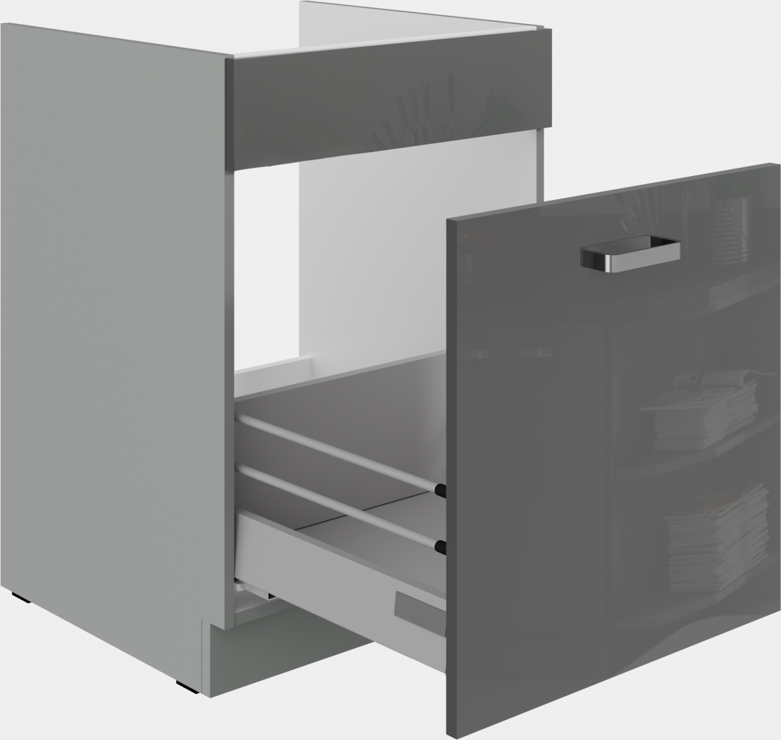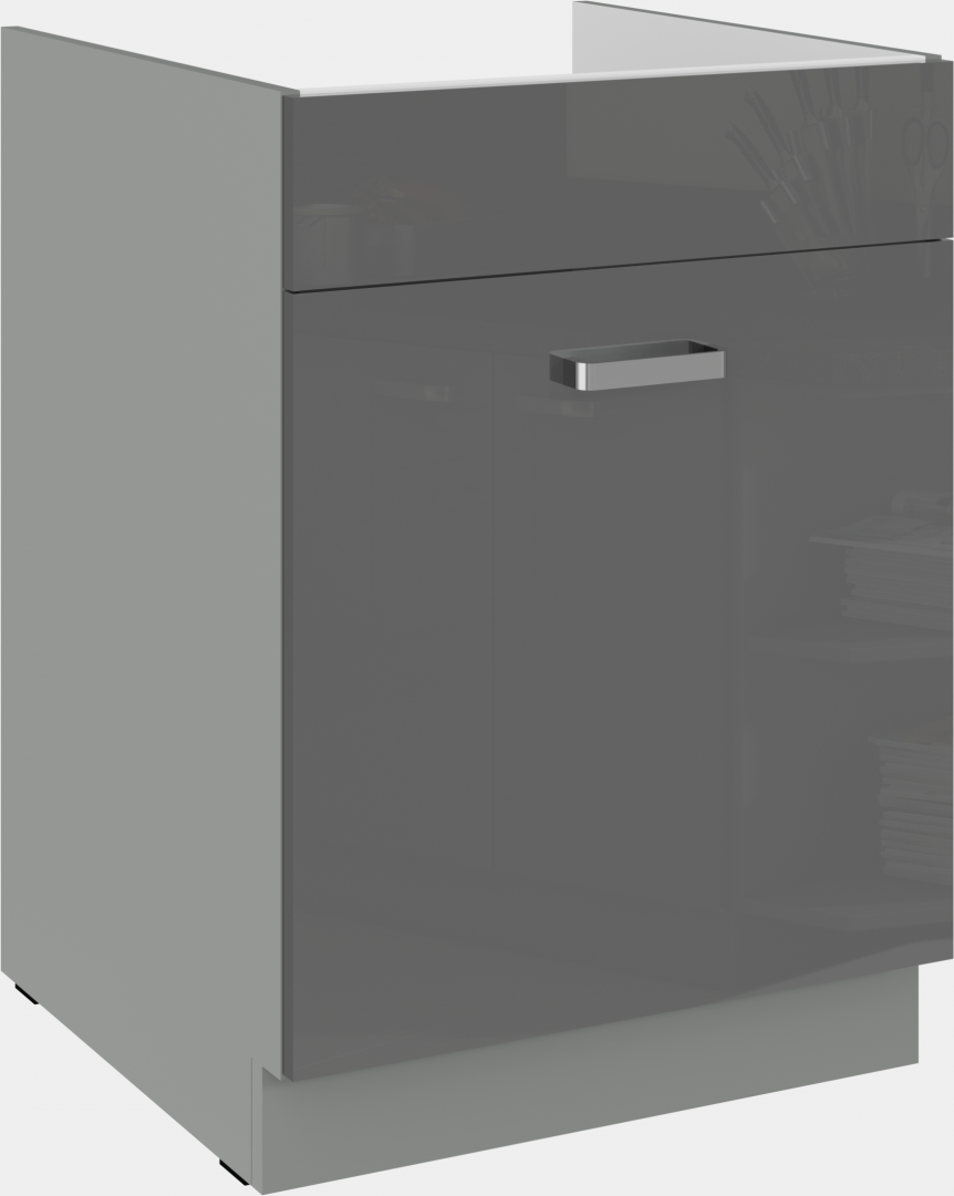 Spodní dřezová skříňka ze systému GREI - dřezová skříňka do kuchyňské linky je uzavíratelná praktickým šuplíkem se širokým úchytem. Dvířka skříněk jsou provedené v moderním šedém lesku.