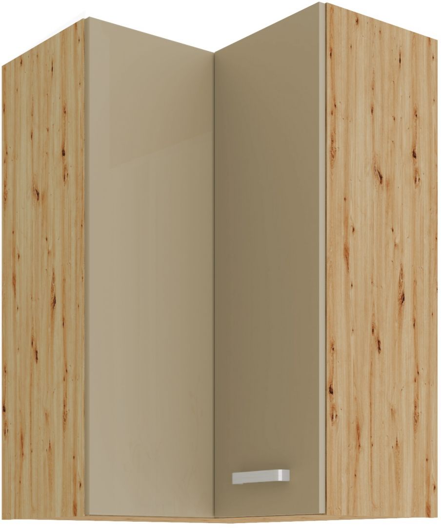 Horní rohová skříňka ze systému ARTTISAN CAPPUCINO - rohová skříňka do kuchyňské linky je uzavíratelná praktickými dvířky se širokými kovovými úchyty. Dvířka skříněk jsou provedené v moderním cappucino lesku v kombinaci s dubem Artisan.
