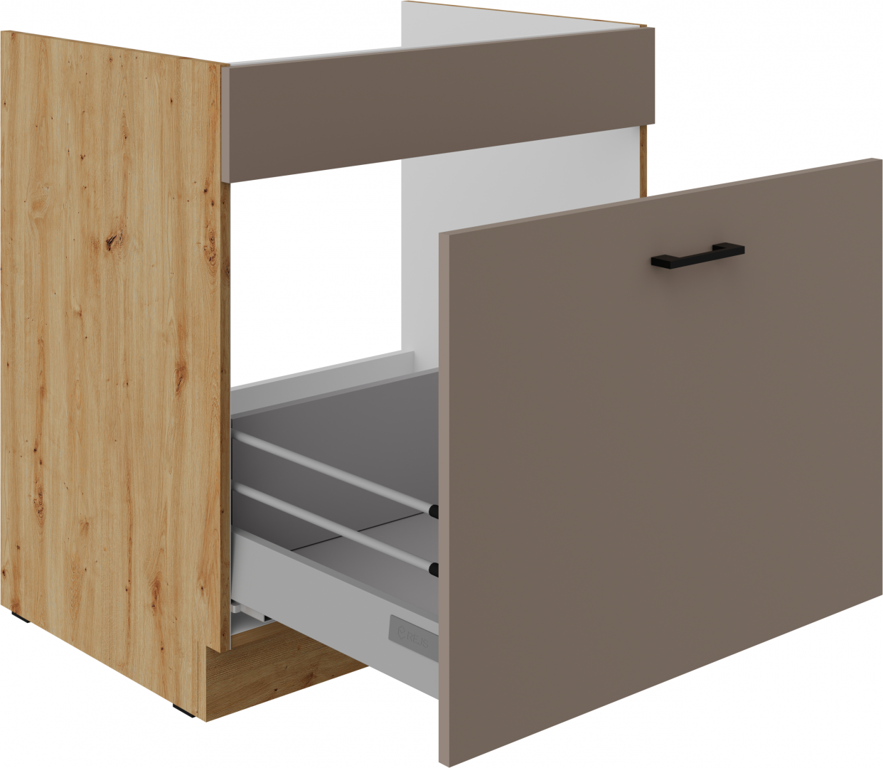 Spodní dřezová skříňka ze systému BOLOGNA - skříňka do kuchyňské linky je uzavíratelná praktickým šuplíkem s širokým plastovým úchytem o délce 136 mm. Dvířka skříněk jsou provedené v moderním lanýžově šedém matu v kombinaci s korpusem v dubu Artisan.