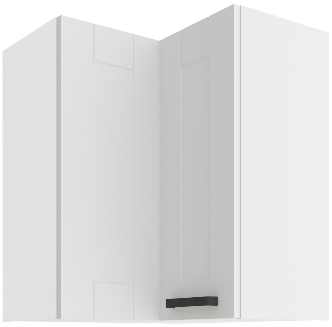Horní rohová skříňka ze systému LUNNA BÍLÁ - rohová skříňka do kuchyňské linky je uzavíratelná praktickými dvířky se širokými úchyty. Dvířka skříněk jsou vyrobeny v bílém matném provedení v kombinaci s bílým korpusem.