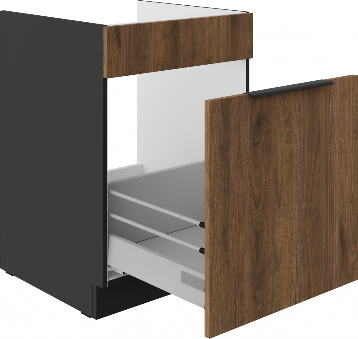 Spodní dřezová skříňka s šuplíkem na koš ze systému MONZA - dřezová skříňka do kuchyňské linky je uzavíratelná praktickým šuplíkem s možností vložení odpadkového koše a s širokým kovovým úchytem. Šuplík skříňky je vyroben v dekoru Okapi ořech.