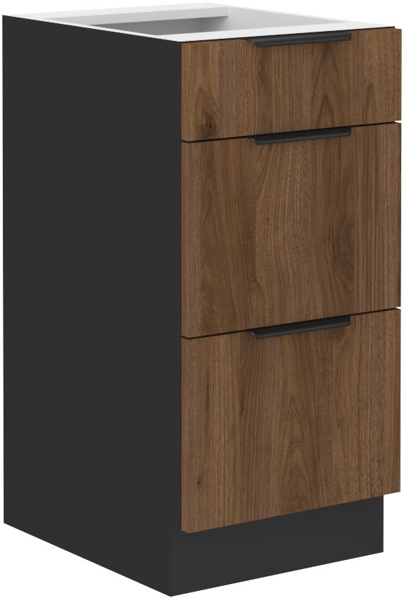 Spodní zásuvková skříňka ze systému MONZA - zásuvková skříňka do kuchyňské linky je uzavíratelná praktickými šuplíky s širokými kovovými úchyty. Šuplíky skříňky jsou vyrobeny v dekoru Okapi ořech.