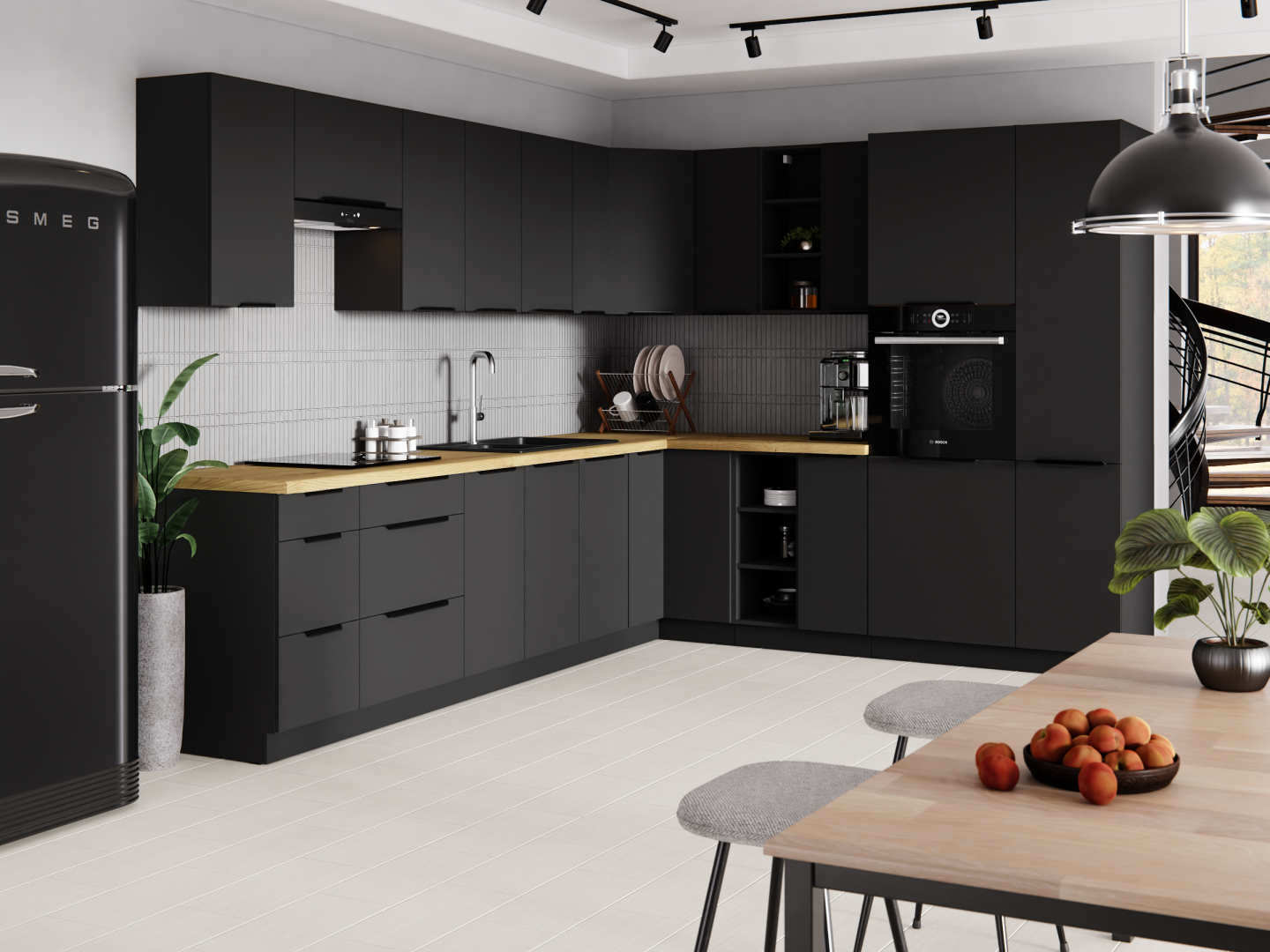 Moderní kuchyňská linka SIENA v barevném provedení korpus černá + dvířka černá. Kuchyňská linka má atraktivní moderní vzhled je tak ideální volbou pro Vaši kuchyni. Dvířka kuchyňských skříněk nebo šuplíků mají tiché zavírání dvířek. U skříněk s výklopem se dvířka zvedají pomocí plynových pístů. V ceně kuchyňské linky jsou kovové úchyty, které je možnost za příplatek nahradit kovovými. U šuplíků velikosti 40, 60 a 80 cm jsou boky šuplíků kovové.