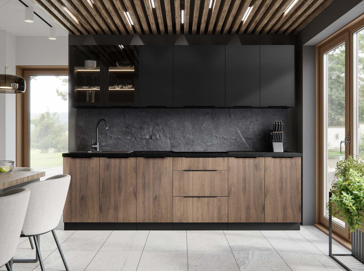 Moderní kuchyňská linka v kombinaci MONZA + SIENA v barevném provedení korpus černá + dvířka Okapi ořech a černá + černá. Kuchyňská linka má atraktivní moderní vzhled je tak ideální volbou pro Vaši kuchyni. Dvířka kuchyňských skříněk nebo šuplíků mají tiché zavírání dvířek. U skříněk s výklopem se dvířka zvedají pomocí plynových pístů. V ceně kuchyňské linky jsou kovové úchyty, které je možnost za příplatek nahradit kovovými. U šuplíků velikosti 40, 60 a 80 cm jsou boky šuplíků kovové. U prosklené skříňky je možno přidat LED osvětlení polic.