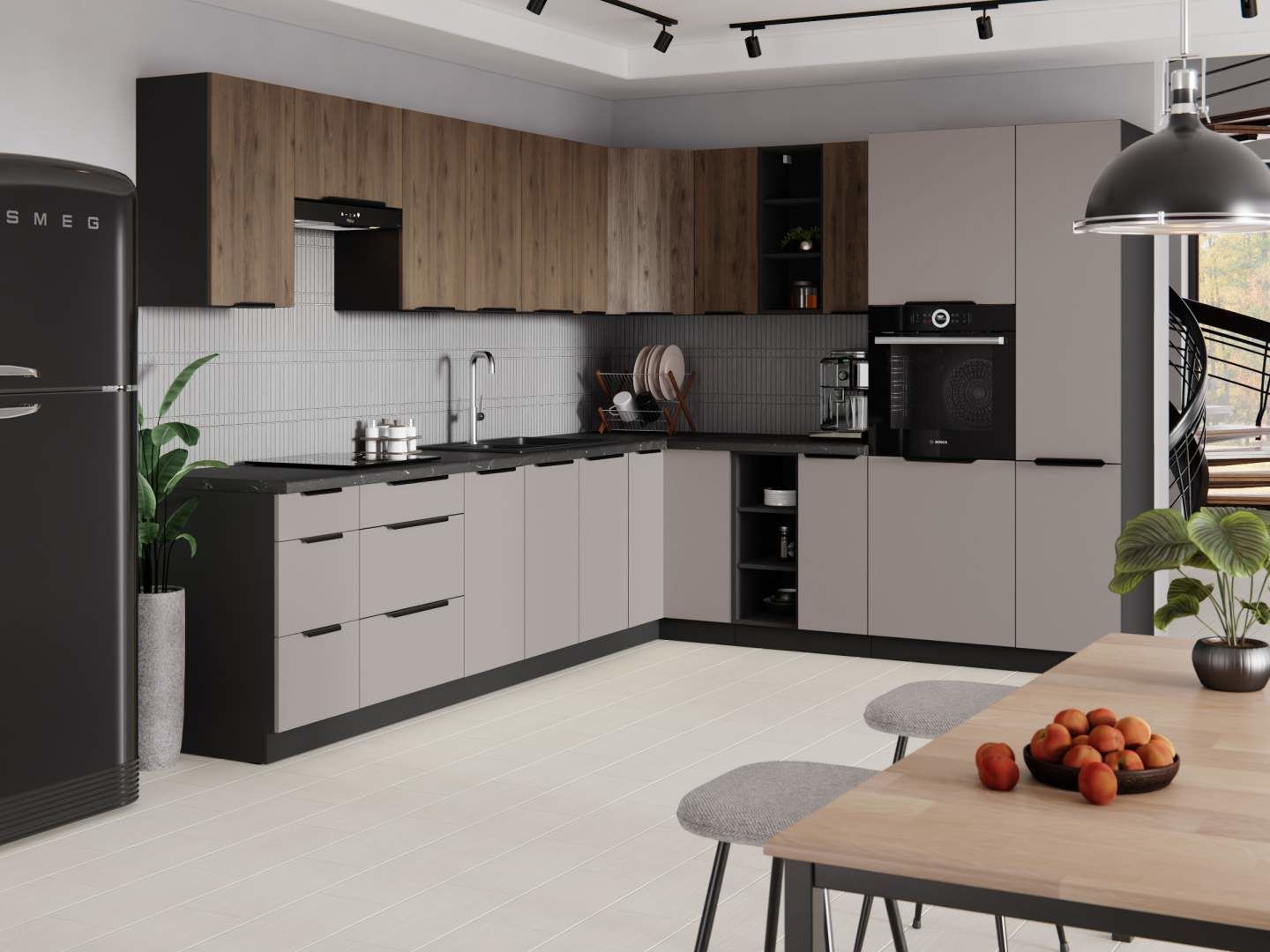 Moderní kuchyňská linka MONZA + ARONA v barevném provedení korpus černá + dvířka Kašmír a černá + dvířka Okapi ořech. Kuchyňská linka má atraktivní moderní vzhled je tak ideální volbou pro Vaši kuchyni. Dvířka kuchyňských skříněk nebo šuplíků mají tiché zavírání dvířek. U skříněk s výklopem se dvířka zvedají pomocí plynových pístů. V ceně kuchyňské linky jsou kovové úchyty, které je možnost za příplatek nahradit kovovými. U šuplíků velikosti 40, 60 a 80 cm jsou boky šuplíků kovové.